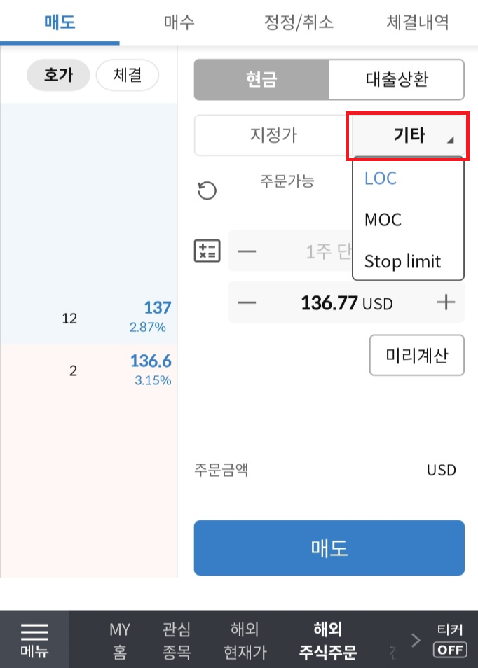 해외주식 주문의 매도는 LOC, MOC, Stop limit 3가지 방법이 있습니다.