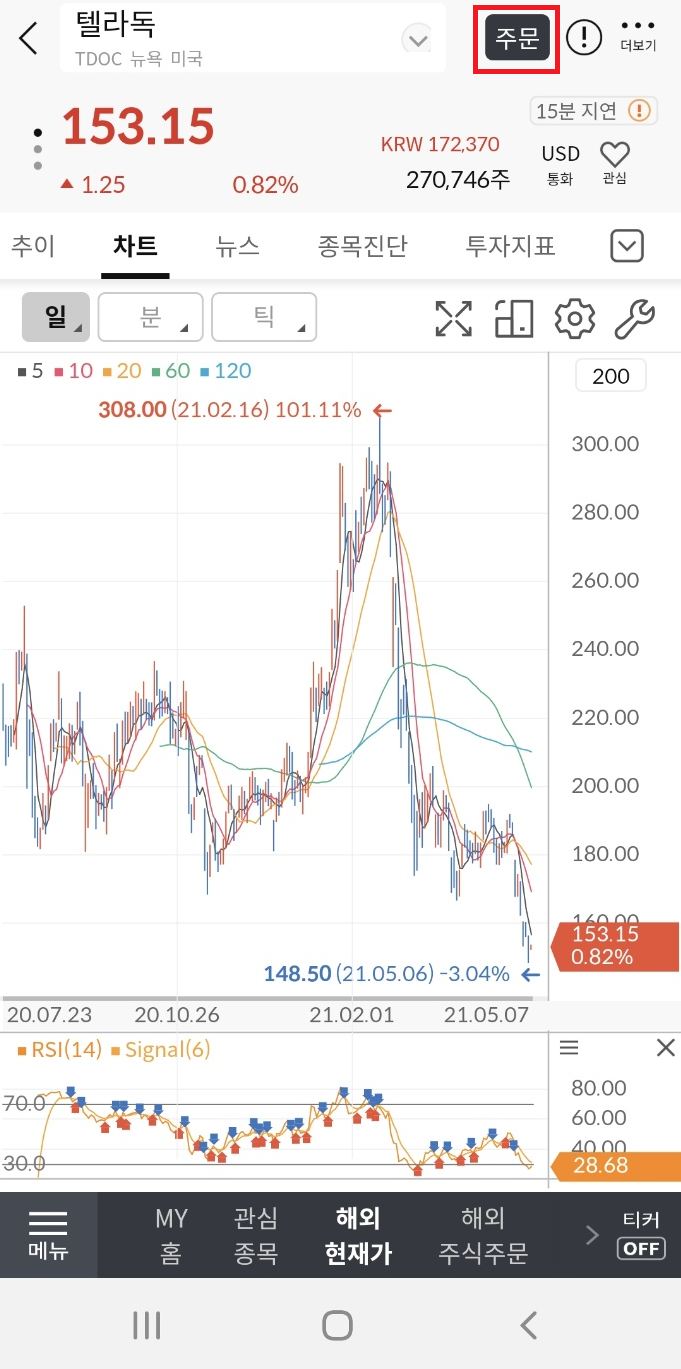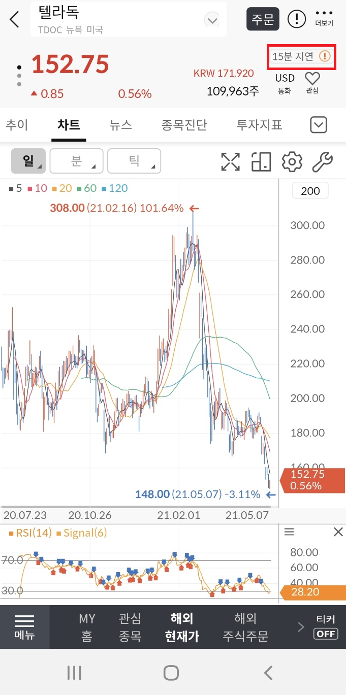 '종합차트' 상단 우측을 보면 '15분 지연'이라는 문구를 확인할 수 있는데요. 이는 현재 창에서 보여주는 가격(해당 이미지의 152.75)이 15분 전 가격임을 나타냅니다. 따라서 매수 시 정확한 실시간 시세를 확인하려면 인베스팅을 사용해야 합니다.