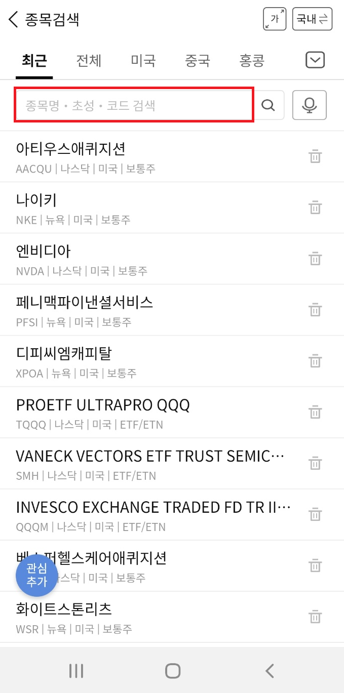 * 체결되었다면 '메뉴' > '해외주식' > '관심종목' 탭을 통해 매수된 종목을 확인할 수 있습니다.