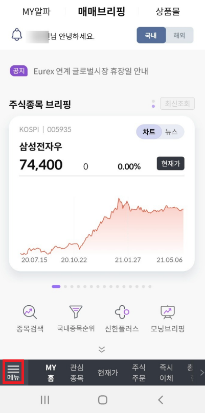 신한 알파 앱을 켜면 다음과 같은 화면이 나옵니다. 좌측 하단의 '메뉴' 탭을 클릭해줍니다.